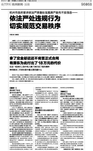 2016年10月13日,本所合伙人、房地产综合部负责人陈钟律师就目前杭州市房价上涨,导致一部分房地产买卖程中出现违约现象,而消费者应该如何去保障和维护自身利益时遇到的常见问题接受《钱江晚报》采访。陈钟律师通过三个案例,向消费者传授如何利用法律知识去正确、恰当的处理以及在签订前期协议时需要特别注意的要点进行详尽的描述。《钱江晚报》在A0004版“杭州新闻·法眼”栏目中刊登了相关报道。