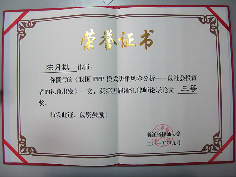 本所陈月棋律师撰写的《我国PPP模式法律风险分析——以社会投资者的视角出发》一文,获得第五届浙江律师论坛论文三等奖。