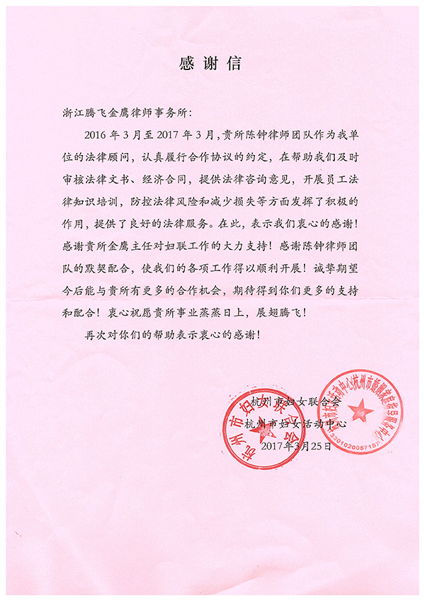2017年5月5日,本所合伙人、房地产综合部负责人陈钟律师及其团队收到杭州市妇女联合会书面感谢。信中表达了对妇联对陈钟律师及其团队的感谢以及对本所的衷心祝愿。
