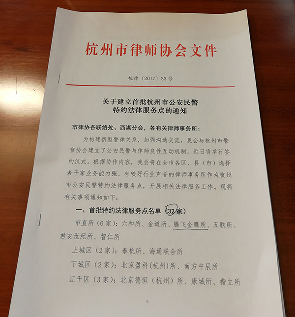 根据协作内容,杭州市律师协会在全市律所中挑选若干家业务能力强、有较好行业声誉的律师事务所作为杭州市公安民警特约法律服务点。本次签约仪式上,杭州市律师协会公布了杭州市首批32家特约法律服务点律所名单,浙江腾飞金鹰律师事务所成功入选。