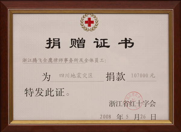 22日,由本所金鹰主任提议,由合伙人律师带头,第二次为四川汶川地震捐款,事务所全体律师及员工共捐款107000元,力所能及的努力是最大的善,事务所全体律师及员工希望以自己的实际行动尽自己的绵薄之力,愿灾区人民早日度过难关、重建家园。