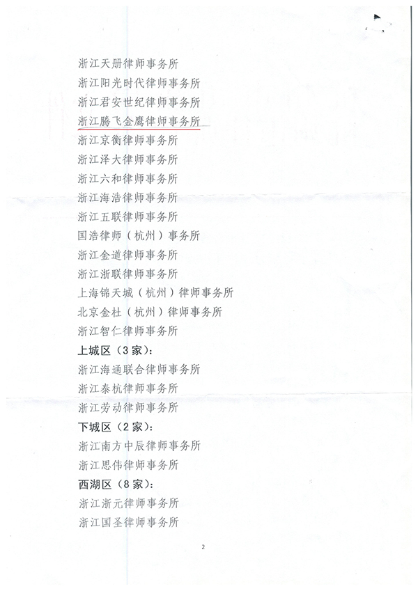 2016月10月20日,为充分发挥行业先进典型的引领示范作用,深入推进实施“名所名品名律师”培育工程,引导律师事务所进一步加强规范化管理,经杭州市规范化律师事务所创建领导小组审核,本所被杭州市司法局、杭州市律师协会授予“杭州市规范化律师事务所”荣誉称号。