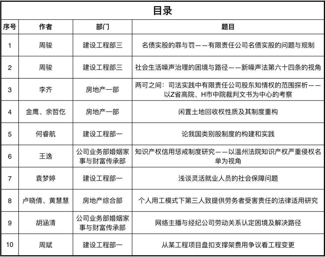 参加本次评选的论文共10篇。选题内容涵盖房地产开发、建设工程、金融、行政法律服务、民商刑事、公司业务、婚姻家事与财富传承业务等多个领域的法律问题研究。