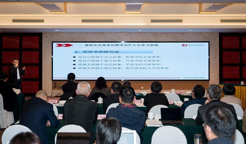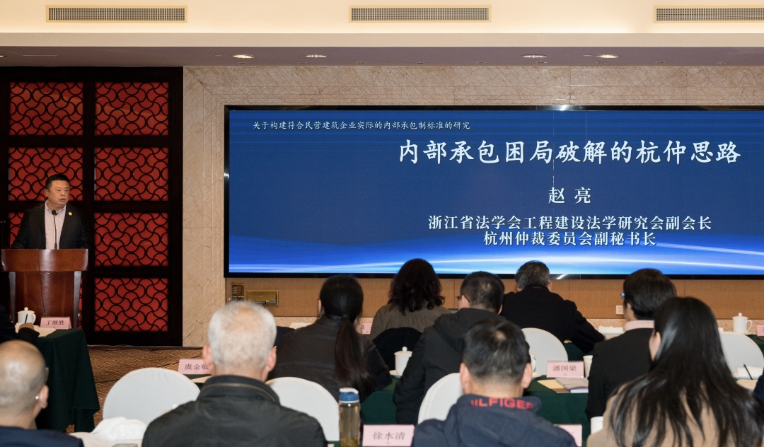 学术研讨会第二单元主题为“关于构建符合民营建筑企业实际的内部承包制标准的研讨”,由绍兴市法学会建筑与房地产法学研究会顾群英副会长主持。浙江省法学会工程建设法学研究会副会长、杭州仲裁委员会副秘书长赵亮先生以“内部承包困局破解的杭仲思路“为题,交流了仲裁机制对处理工程领域内部承包纠纷的价值与要求。浙江省法学会工程建设法学研究会秘书长、浙江东鹰律师事务所合伙人杨国锋律师以辨析工程领域内部承包模式与转包、挂靠边界为切入点,在内部承包构成要件问题上提出了自己的想法。浙江省法学会工程建设法学研究会常务理事、浙江省三建建设集团有限公司副总法律顾问胥袁女士立足建筑业法务工作第一线,提供了建工企业关于模拟股份制经营模式的探索经验。江苏省住建集团有限公司法务总监潘春祥先生以案例分享方式,就当前形势下施工企业工程款债权难兑现问题分享了破局思路。浙江省法学会工程建设法学研究会副会长、中天控股集团有限公司法务总监陈剑先生,重点剖析了民营建工企业推行内部承包制的历史价值与尴尬现状。